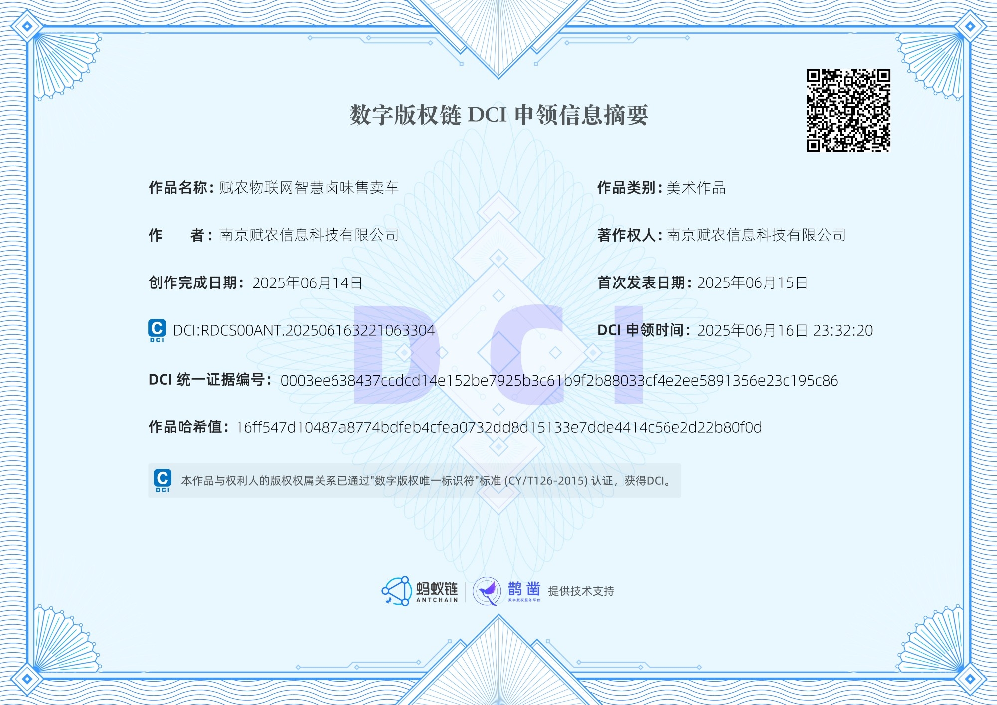 赋农物联网智慧卤味售卖车DIC数字版权认证