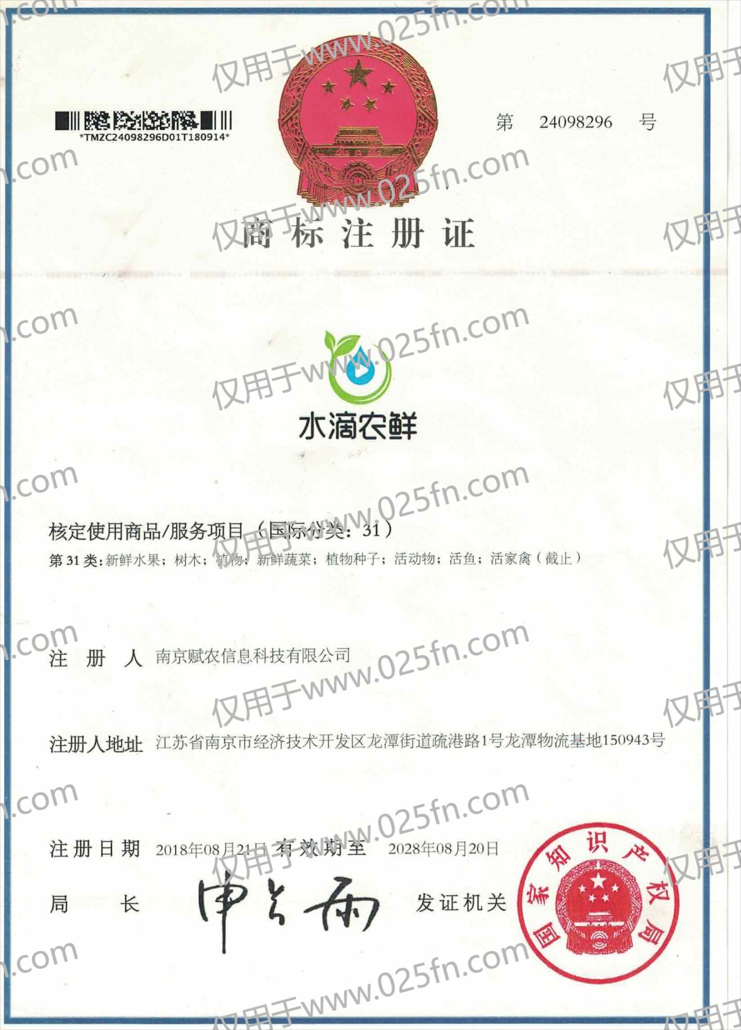 赋农【水滴农鲜】商标注册证31类
