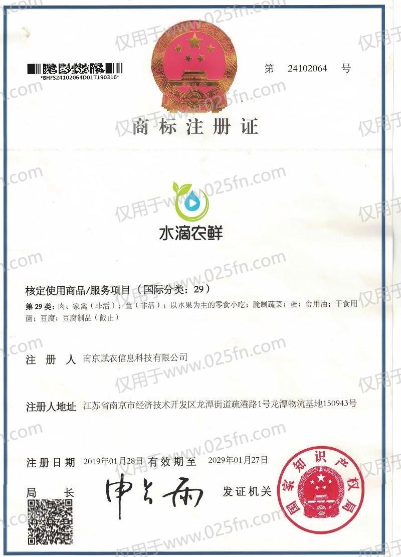 赋农【水滴农鲜】商标注册证29类