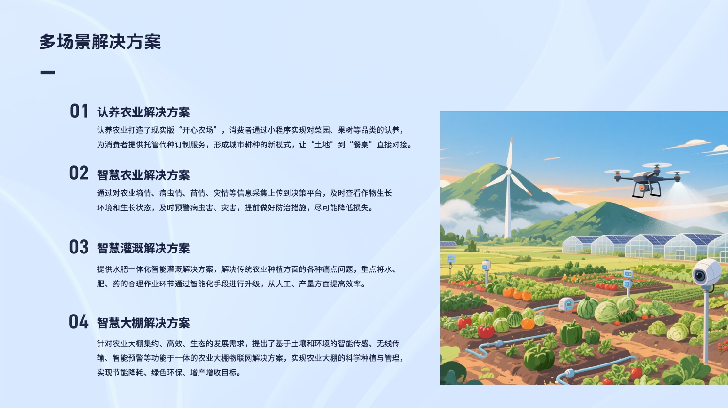 | 智慧大棚 | 环境四合一传感(温/光/湿/CO₂)、自动卷帘、补光调控 | 反季种植增效200%,能耗降低35% |